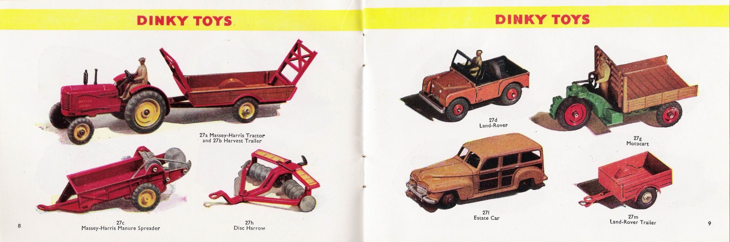 In 1948 Meccano Liverpool started production of series 27 agricultural models first referred to in the 1955 USA catalog as “Farm Equipment”. It consisted of 13 models in total. 27A Massey-Harris Tractor is part of series 27 Farm Equipment and was the first model issued from June 1948 till 1966. From 1966 to 1971 the model continued under the name Massey-Ferguson Tractor and was renumbered 300. It is one of the most produced models in terms of numbers made by Meccano Liverpool.