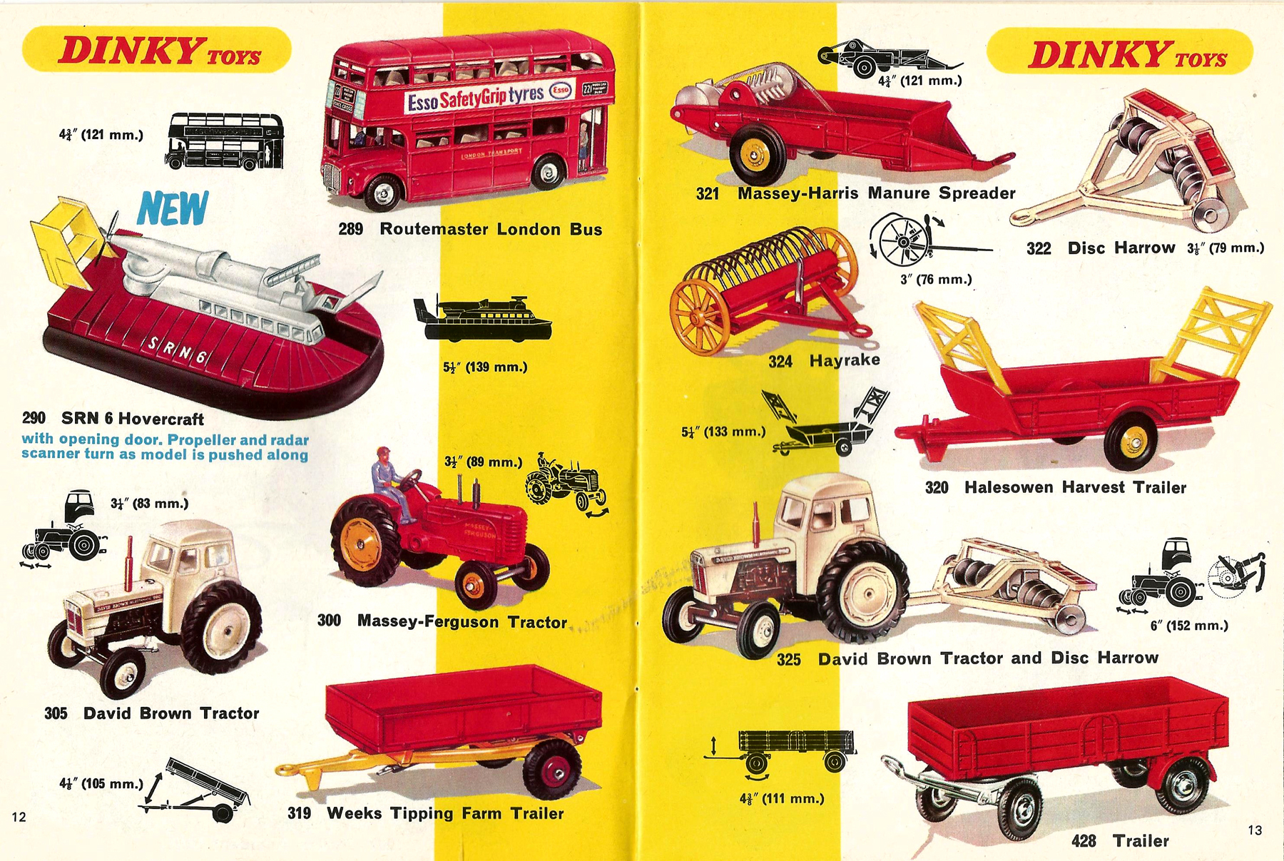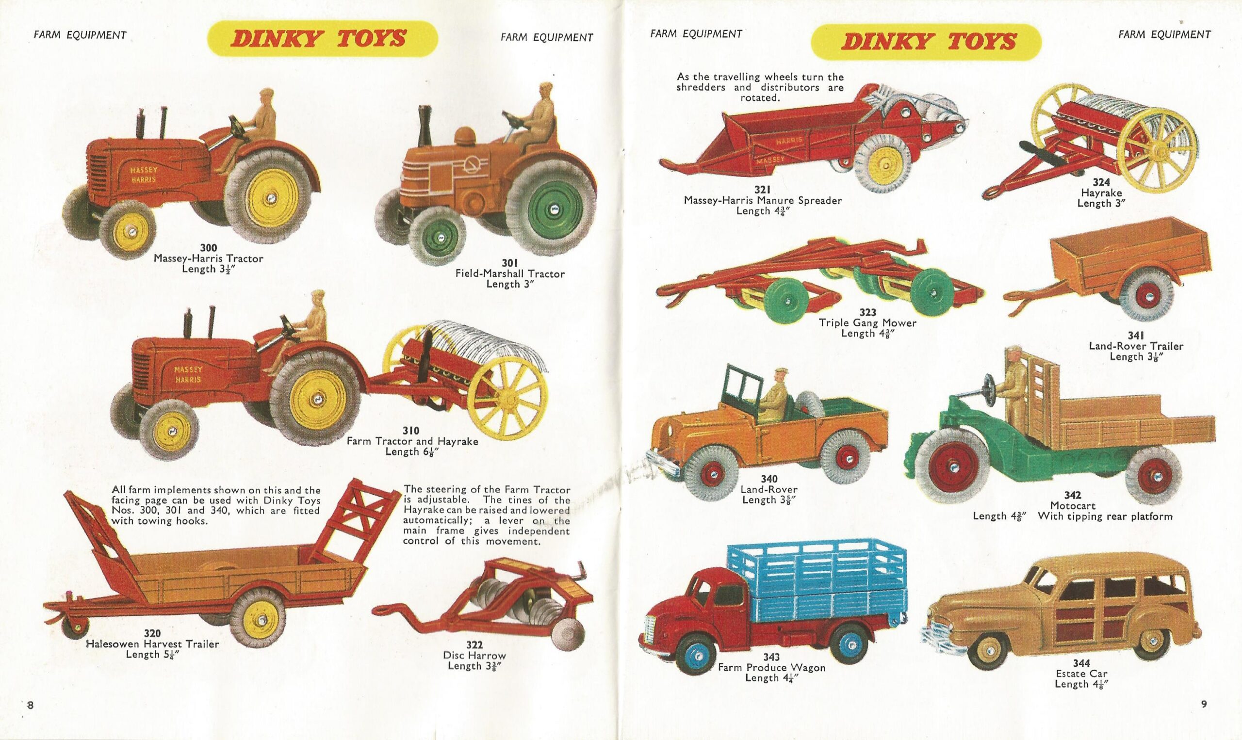 Farm equipment models arranged as in the Dinky Toys 1957 UK catalog above.