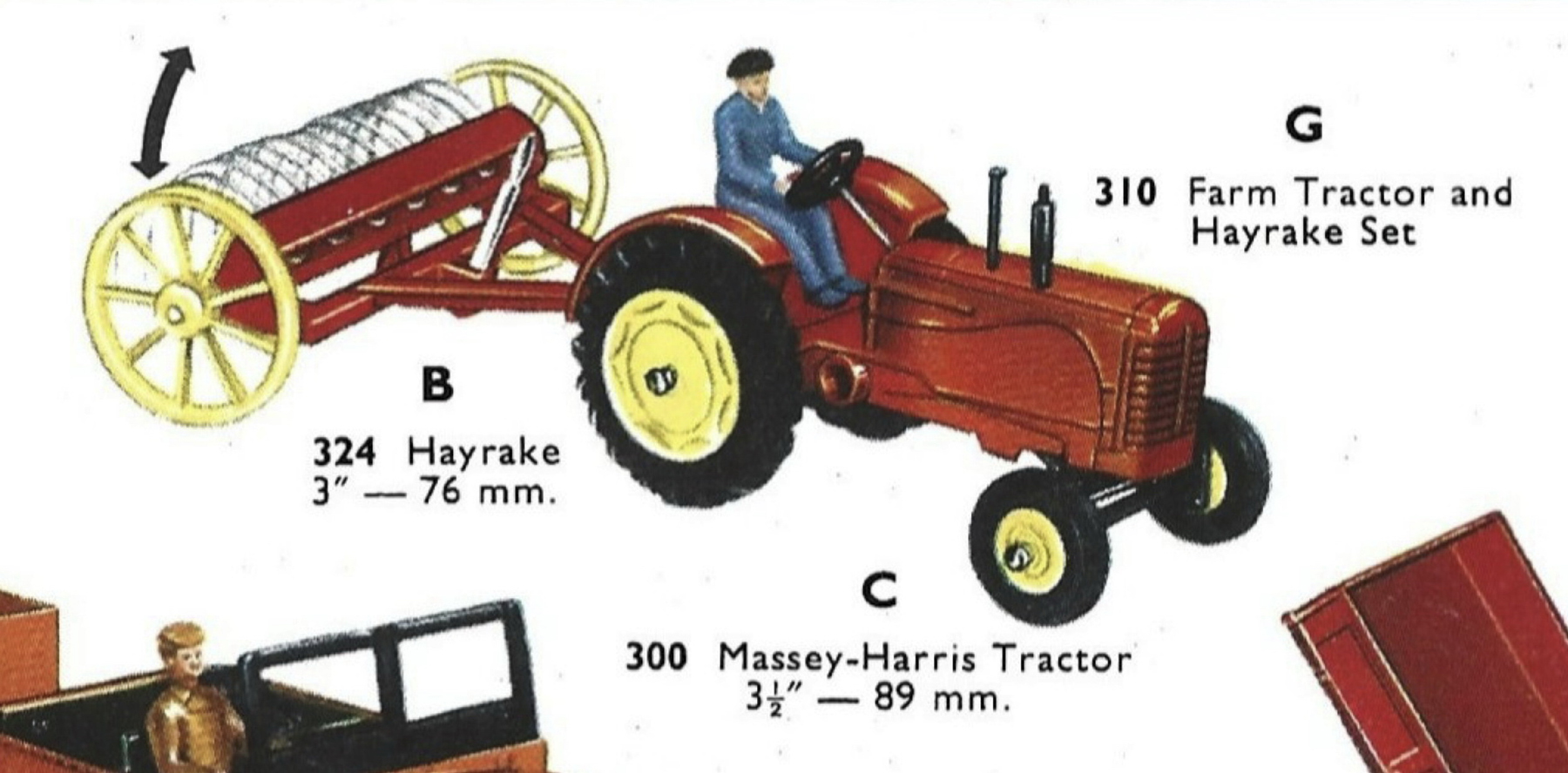 The Massey-Harris Tractor brand name was used by Meccano Liverpool up to and including the 1965 catalog. In 1964 and 1965, Massey-Harris tractors were shown in catalogs with the name Massey-Harris Tractor, but without the brand name on the model. Perhaps Meccano Liverpool didn’t yet have permission to use the new brand name Massey-Ferguson and this was not arranged until 1966, when the models and catalogs started appearing with the Massey-Ferguson brand name. During this transitional period 1964–1965, Massey-Harris tractor models were issued without the brand name on the model.