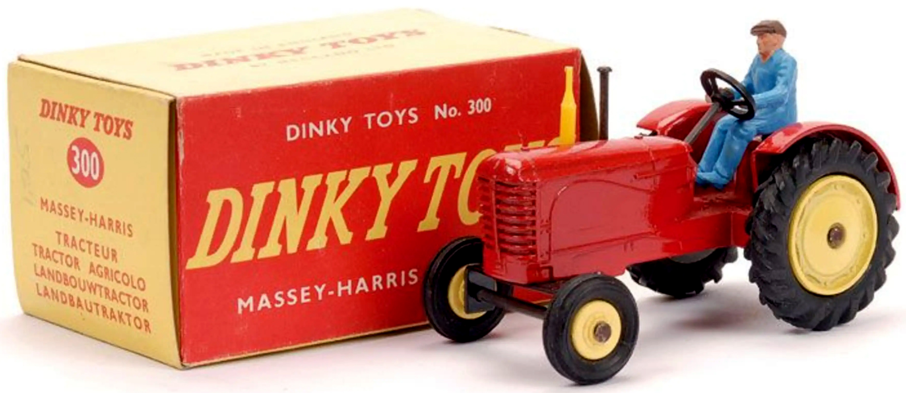 The Dinky 300 Massey-Harris Tractor assembled and sold in South Africa by distributor Arthur E. Harris. Box printed in South Africa with text in English and Afrikaans.