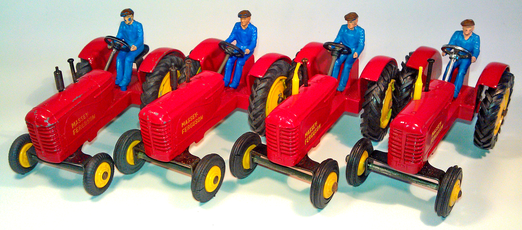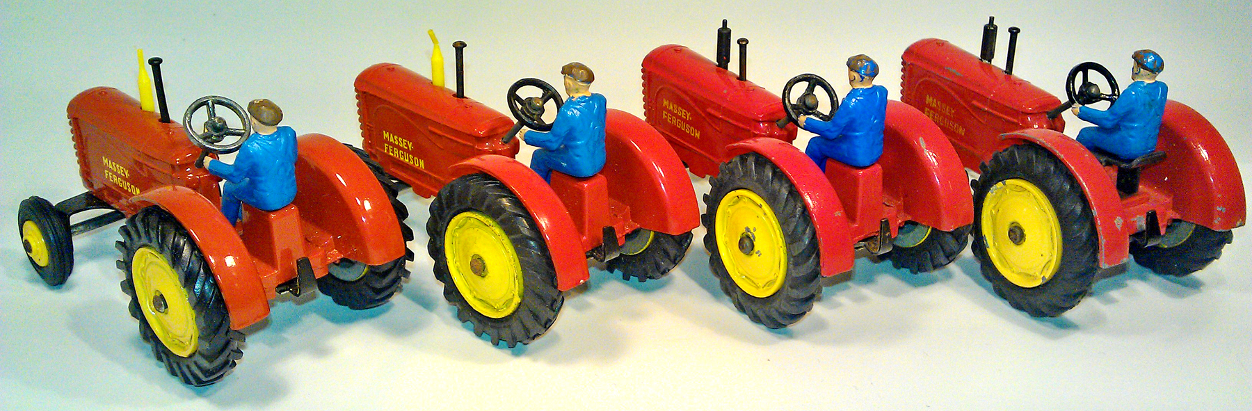 My Massey-Ferguson collection shows the change to a cast-in red colored seat and a yellow plastic exhaust pipe. On the far left a driver sits on an open black metal seat. All Massey-Fergusons are fitted with black rubber tires.