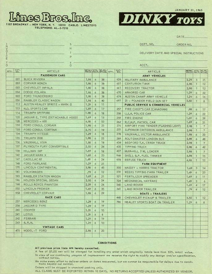 Three leaflets or flyers have been seen for the US market along with a price list. I assume the oldest one used color drawings of the original cars before any prototypes were ready to photograph. The green US price list is dated January 1965. Both are marked Lines Bros. Ltd. and show 004 as a Dodge Polara convertible which was replaced by the Oldsmobile 88, perhaps being easier to manufacture than a convertible. Trademarks might not have been such a stumbling block in the 1960s but that may have been an issue as well. The third picture below shows the back of a 1967 leaflet for the US. Lines Bros. isn’t mentioned in this one.